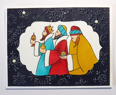 I colored the image (unknown) using alcohol markers. It was cut out using the Labels 4 die from Spellbinders. The background was some navy glitter card stock that I ran through a snowflake embossing folder by Paper Studio. When I ran it through, the white core of the paper made a white outline of the raised areas.