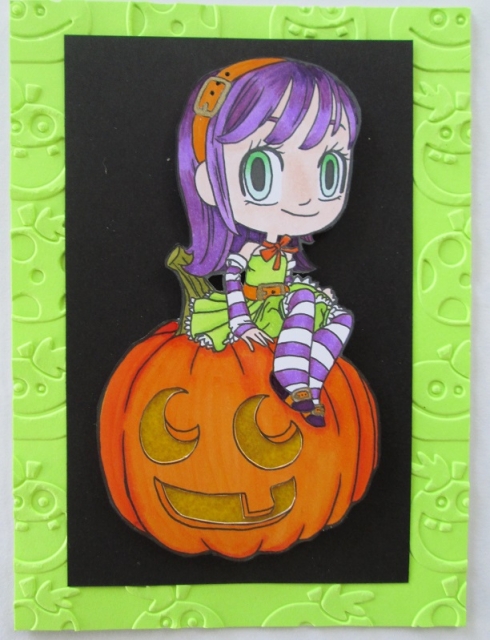 It may be a bit tough to spot the vellum, but I used it to make the jack-o-lantern look like it has a candle in it. The image is a digi stamp by Some Odd Girl. After printing, I colored with Copic markers. I then fussy cut out the face on jack and then the whole piece. I attached yellow vellum behind the jack-o-lantern's face. Then I realized I wanted to put her on black cardstock, so she would pop. I figured it I didn't back the vellum with some white cardstock, you wouldn't be able to see the color. Since I was doing that, I figured I would add glitter glue to the white cardstock to make it glow. The card base was embossed with a folder but I can't remember if it by Sizzix or Cuttlebug.