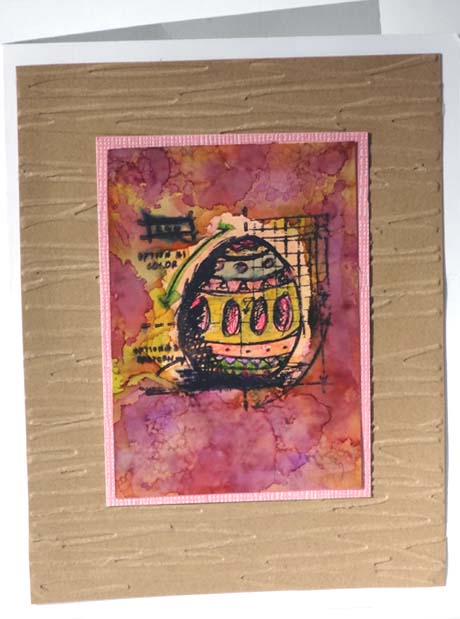 Here I added a solid color AI to create a frame for a preselected stamp. I used my small round applicator when it felt it would be easier to use make the desired shape. I like the ragged edge look and even the white edge before the agate style background begins. I used ATC sized pieces as I explored this method.