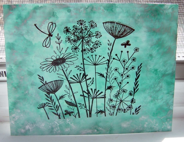 Finally here is my background with an image stamped in what was supposed to be a frame/window type thing. I had trouble with this one. My ink dried too fast and adding more blending fluid didn't help in making the window/frame.