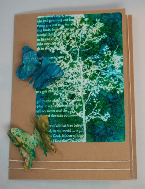 I wanted to try the tutorial Jennifer McGuire did on the paper flowers, but I used butterflies instead. I used newsprint paper as the base of the butterflies (the card itself is actually reseting on paperprint in the photo). I colored and to get them to stand up, I wadded them up and unfolded, glued together and fluffed.
