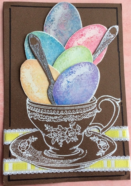 The cup & spoons were stamped with Versamark & heat-embossed on the brown CS. Cup is white EP & spoons are silver.