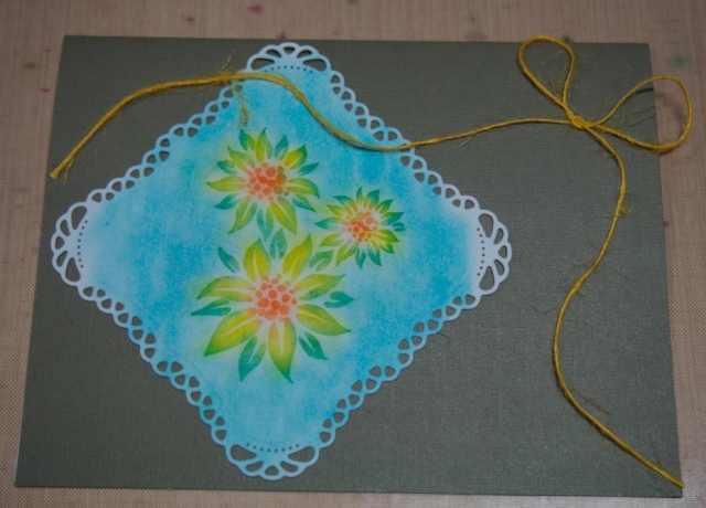 I stamped the flower image in Versamark and pounced Faber castell chalk on the image using tiny pom-poms. I die-cut the image out, adhered, and added twine to the card base.