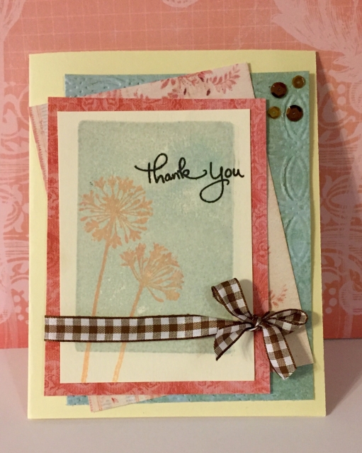 I did my shadow stamping with the reverse size of a postcRd clear stamp from lawn fawn. Inked it up with versamagic chalk ink in oasis green. Stamped the flowers(stampendous) with colorvox ink in sweet melon. Sentiment is stamped im Versafine black onyx.added some sequins and gingham ribbon as embellishments. TFS :-)