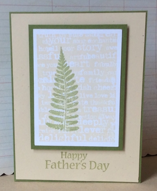 I used Hero Arts shadow ink in Soft Sand to do the background stamp (can't remember the name of it) and then used Colorbox Fluid Chalk ink Olive Pastel to do the Fern (Rubber Stampede Fern Frawn). This is something I stamped probably a year ago and needed to use up.