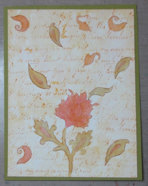 I stamped the flower and leaves with DI in Vintage Photo and colored with koi watercolors. Then I stamped the script stamp and inked the edges with tea dye. I blended the script on the images. But it was too white. So I went back and added some DI in tea dye over the rest of the card. That wiped out the script stamp, so I had to stamp and blend it again. The flower stamps are by Altenew and the script stamp is by Stampendous.