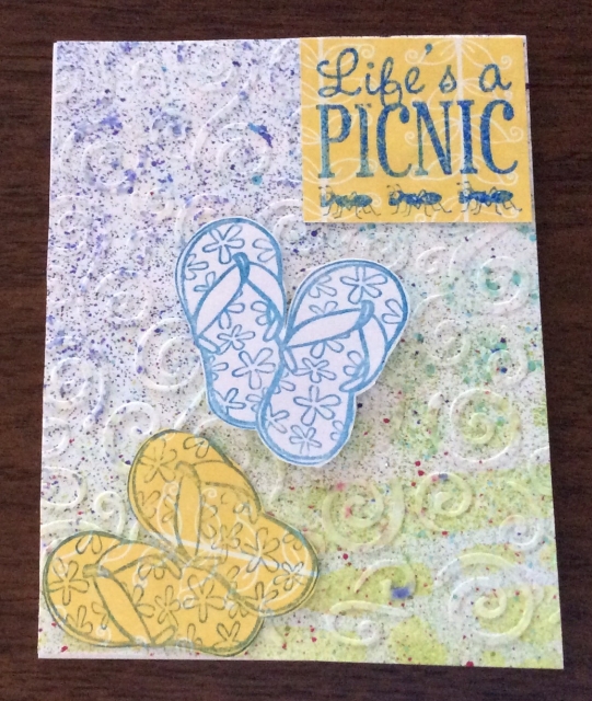 Stamped words and flip flops and embossed.