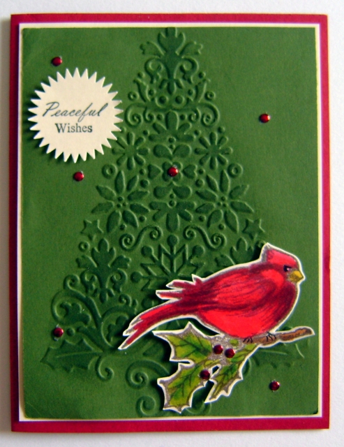 I found the background already embossed in my stash. I swiped over the tree with Versa Mark ink so that it would stand out more. I stamped the cardinal from Inkadinkado, colored it with Spectrum Noir marker and fussy cut it. It was pop dotted to the card. The saying from Sparkle N Sprinkle was cut out with a punch and also pop dotted to the card. Red enamel dots were added for embellishment.