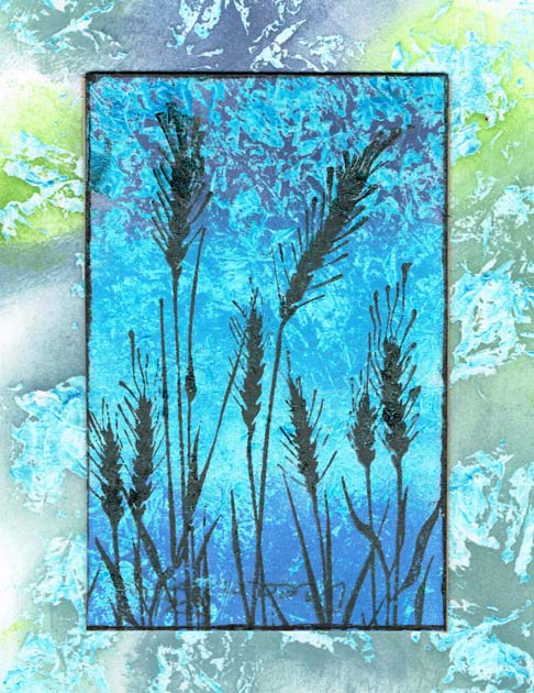 I made 2 different resist backgrounds with Liquid Pearls for this card. For the larger background I slightly mixed white opal LP with ocean pearl on my craft sheet before applying. I tried to leave considerable white space. The resist for the focal image background is silver pearl and the resist inks are blueprint sketch, salty ocean, and chipped sapphire. And stamped focal image with VersaFine black ink.