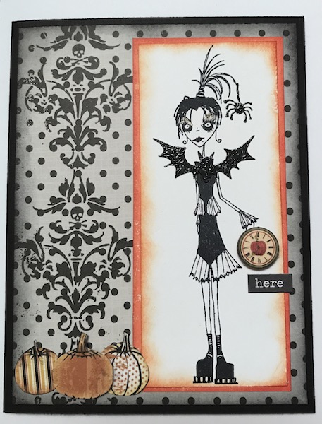 I took Daniel's Gussied Up challenge to gussy up my topknot girl. See the forum post for a view of the original topknot stamp. The original girl was stamped with black ink. After she was dry, I added a spider hanging to her hair and batwing sleeves with Versafine Onyx Black ink and embossed them with clear embossing powder so her accessories shine. I added clear Wink of Stella to her ruffles and she's sporting gold Wink of Stella eye shadow. She's offering a poison apple (might be a pumpkin, but it reminded me of an apple and it's pretty tiny so you can't really tell). The "apple" piece was punched from pattern paper and the pumpkins were fussy cut from patterned paper. The word "here" is a Tim Holtz Chitchat sticker. This card has a black cardstock base.