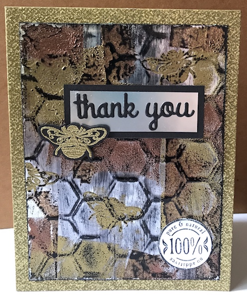 I made another card using a Tarnished background. In this case, I did stamp a bee and emboss in gold before pressure embossing the honeycomb. I used gold and copper embossing powders and black Stazon ink. The base is Silhouette silver printable sticker paper, adhered to cardstock.