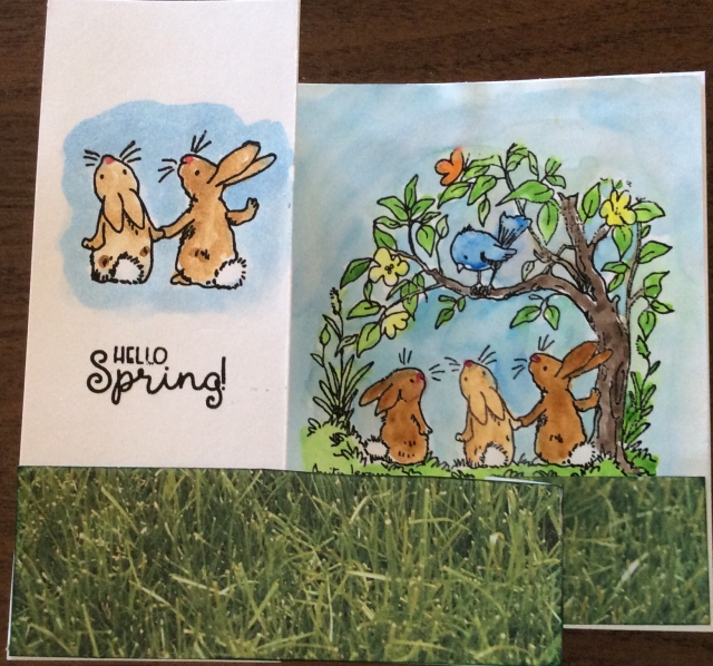 These stamps are SOOOOO cute! I love the watercolor with them too. Looks very storybook. The green grass paper is a fun thing to use for the z fold.