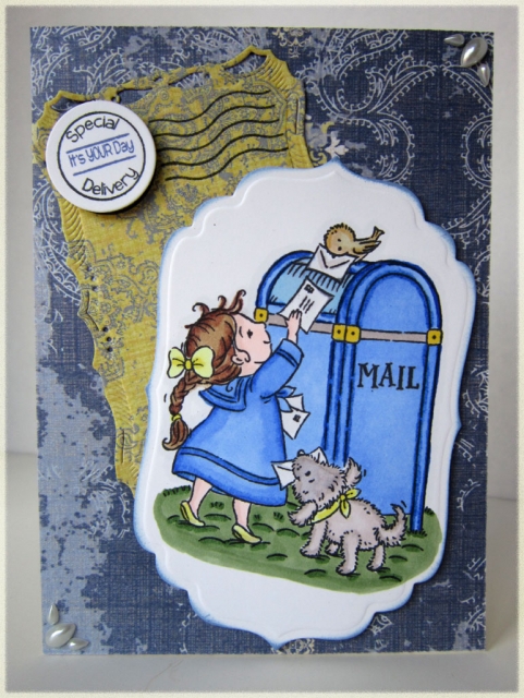 This is the cutest image! I love how you colored it too---looks great! and the pop up for the postage is neat! TFS!