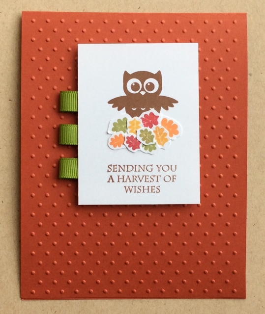 Stamped Owl and sentiment in Chestnut Roan ink. Stamped leaves out separately and fussy cut, then glued into place randomly with wet glue.