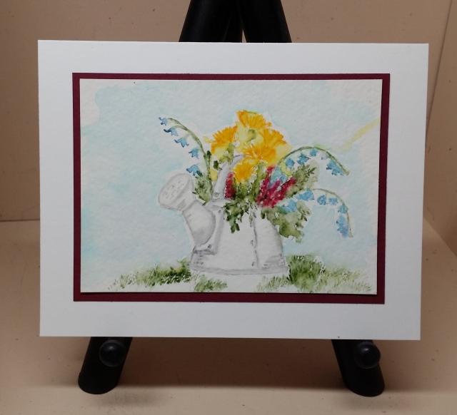 This is a Thank-You card for Jan, she told me she liked watering cans. I painted the image a long time ago, but I wasn't satisfied with it; it was a poor cousin to the ones painted by my crafting buddies. Now, without their masterpieces to compare with it, it looks pretty good to me. lol. I do love that watering can.