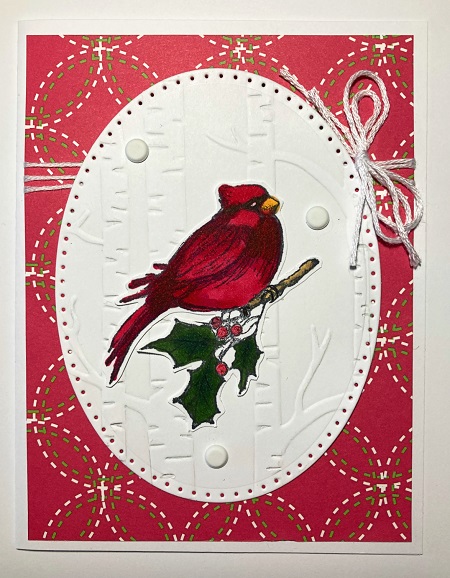 Beautiful. The cardinal is wonderful, and I love the embossed oval background. The background design was a good choice. TFS. Daria