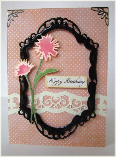 The main frame to this has been cut out of black cardstock and then a couple coats of UTEE embossing powder to give it that shine. I used inks and markers to color the flowers
