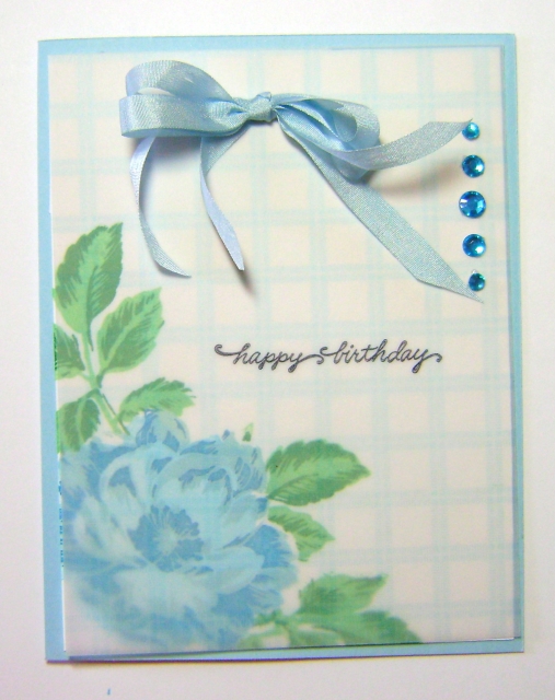 I stamped the flower and leaves (masked) onto white cs and then overlaid it with patterned vellum. Added bow, verse and rhinestones.