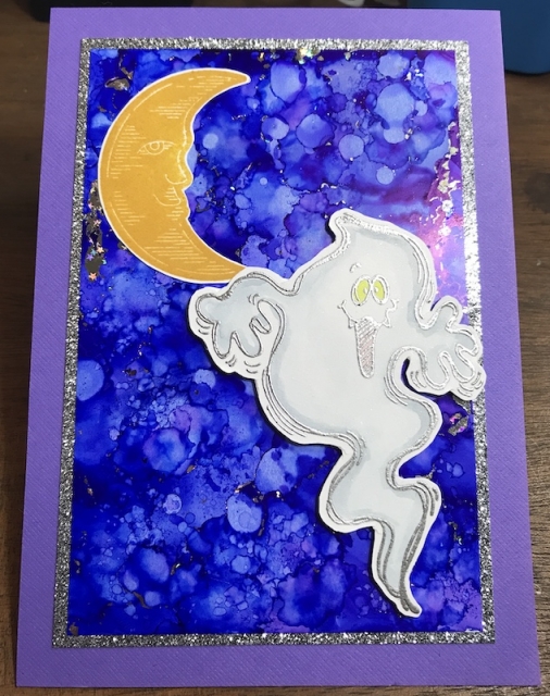 Ghost is Stampendous, stamped and embossed with Brutus Monroe Sterling EP and colored with Tombows that I scribbled on a pallette and picked up with Wink of Stella for a little sparkle. Fussy cut and mounted witn foam.