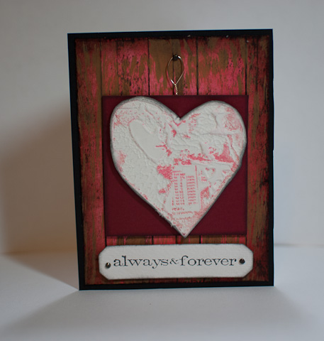 The heart is the impressed part of the card. I used modeling paste and some red ink. Most of the ink didn't stick to the modeling paste. I make a picture out of cardstock and hung it on the wall with jewelry wire. The wall is the background from Far North's warm up challenge. I put the sentiment on trying to make this look like a picture on the wall with the plaque under it.