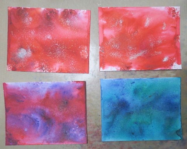 I made 4 backgrounds with the technique using brushos. On the top left one, I used embossing tinsel. On the top right one, I used vintage champagne. On the bottom 2, I used clear embossing powder.