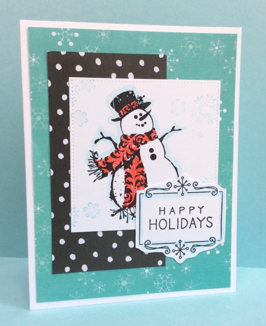 Supplies: Inkadinkado Snowman stamp, Studio G Holiday greeting stamp, Unknown snowflake stamp, Versafine Onyx Black ink, Heidi Swapp Marquee Love paper pad, DieNamics Pierced Square dies.