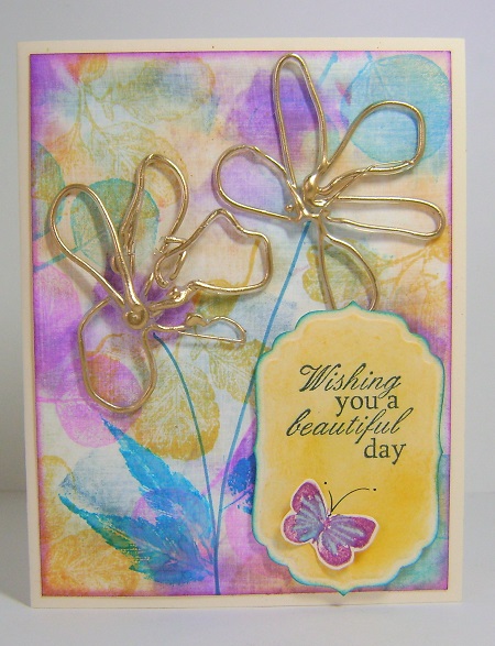 Here is my finished card using mu glue gun "flowers." Thanks, Daniel, for a fun technique. Tha background is a technique called faux linen.