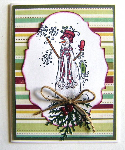 The image is an Anita's stamp that I stamped onto a no brand die shape. It was colored with colored pencils and sponged around the edges with Distress Aged Mahogany ink. I punched the greenery using a Tim Holtz punch and added cord and enamel dots.