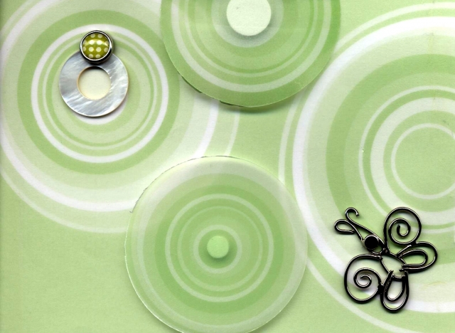 Green and white circle vellum was used for the background. Punched circles from the same vellum and added with glue dots, which also show as the centers. This added 3 D effect as well as darker shade of the vellum. Added white glaze circle with green and white brad and also a metal butterfly brad. I really liked this color comb.