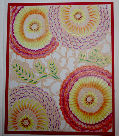 I love the relaxation that comes from colouring. I coloured this Asian Mums stamp with Prismacolor pencil crayons. This Pencil and Ink technique can be found on the Technique Junkies Bodacious Backgrounds Stamps CD.