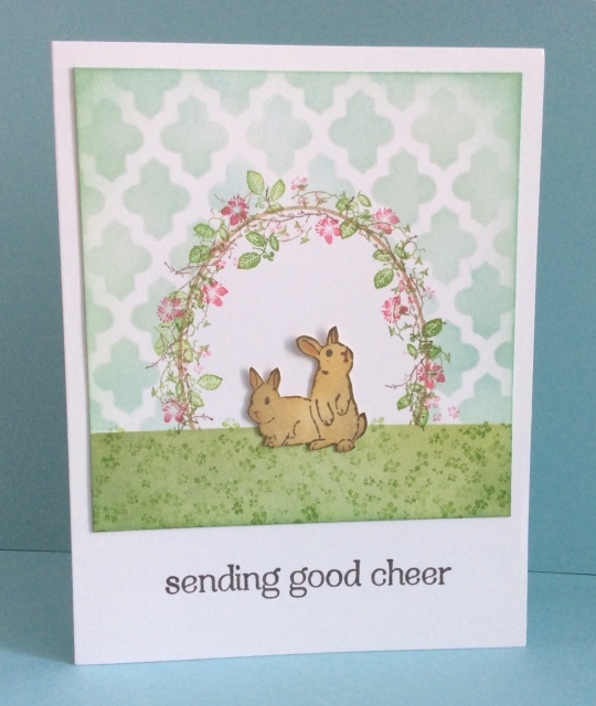 Supplies: Gina K Designs Warm Spring Wishes (Oval), Rubber Stamp Tapestry from Cherry Blossom and Herbal Sachet sets, Art Impressions Try-Folds Furries, Hero Arts sentiment, Avery Elle Pigment inks, Versafine Smokey Grey ink, Distress Inks Pumice Stone, Tumbled Glass, Bundled Sage, Peeled Paint, Heidi Swapp Stencil