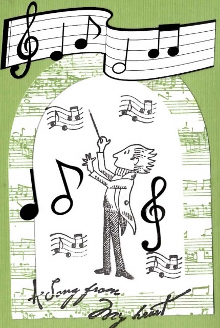 Used die cuts and cuttlebug to cut the arch and then stamped with music stamp. Inserted the cut out part of the die and stamped with conductor and musical notes. Also added stickers and a sentiment stamp.
