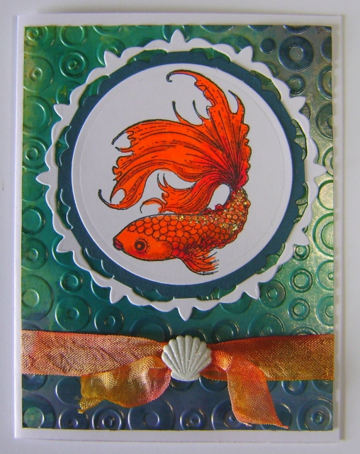 The embossingn looks really neat on your background. The glitter on the fish looks so good and also the contrast in the overall color scheme!