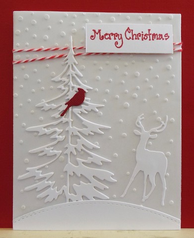 Another fairly simple card, using an EF (Tailored Expressions) on velum, then adhered to white card base. Attached die cuts to panel. Tree - Sizzix, Deer - I.O., Bird - I.O. Stamped quote (Azada Stamp Design) , and attached red twine. Hill die cut: LaLa Land. TFL