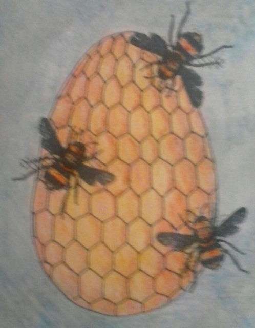 Those bees are way too realistic! Yikes! Beautiful honeycomb egg with great shading. TFS. Daria