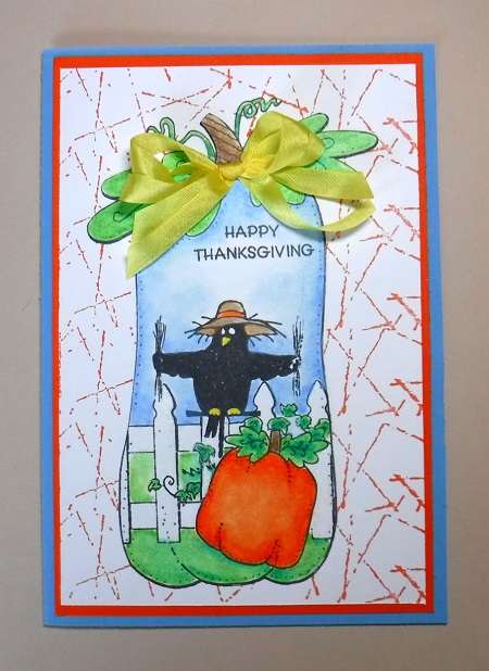 Here is my masked card! I filled in the tall pumpkin again and this time I added a fence. Masking is not my thing, but I did it and I like how it came out! Now I have 2 Thanksgiving cards. Yay!
