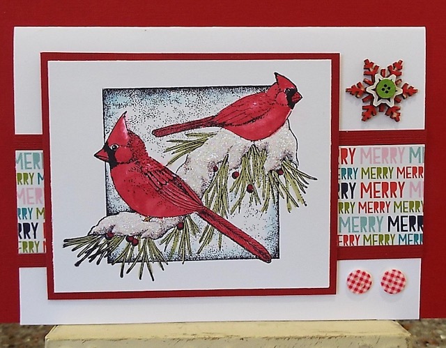 Stamped image (C.C. Designs), and colored with Copics. Applied Stickles to snow. Adhered image with foam tape to patterned paper panel, then white card base. Added buttons and star embellishments. I made two cards using this image. TFL.