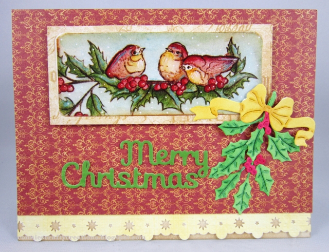 Love all the detail in the holly die, especially the way you colored it. Love the non-traditional yellow bow, it really compliments the birds.