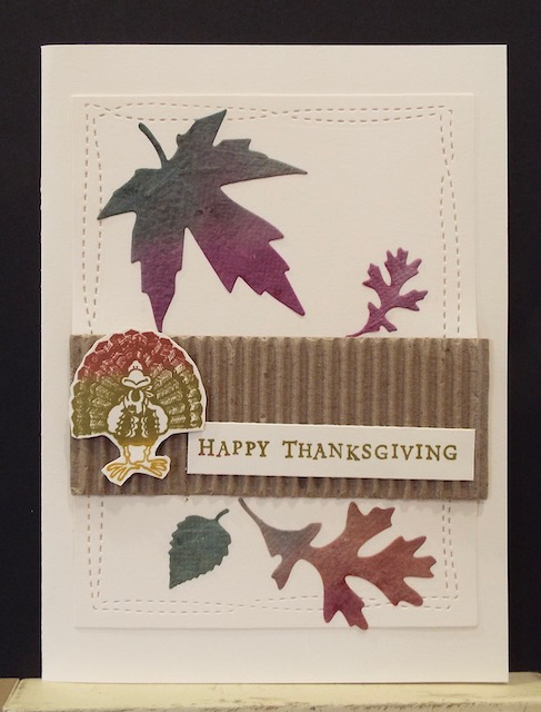 Die cut leaves from old handmade paper I have had for a long time, and adhered to card. Adhered corrugated strip, and attached stamped quote and stamped turkey from long ago. TFL