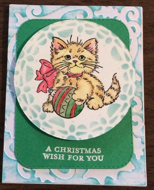 Cat embossed on stenciled circle , background dry embossed. Words embossed