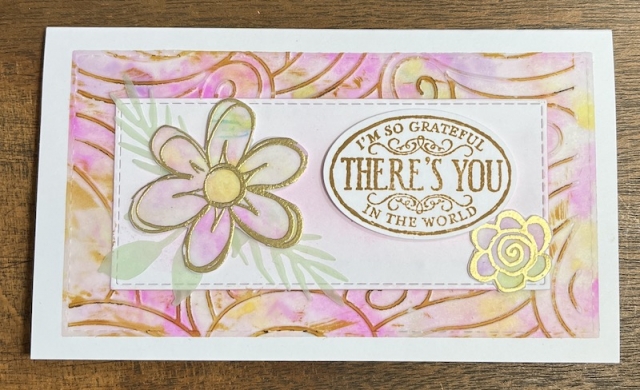 I used Bic Mark It alcohol markers on SU Vellum to create my background. The smallest flower is adhered flat to the paper. The bigger flower is on thin foam squares and the sentiment is on a bit thicker foam squares. The flowers were embossed with gold EP. I colored the center of the big flower with yellow marker on the back side (like Tina colored her leaves).