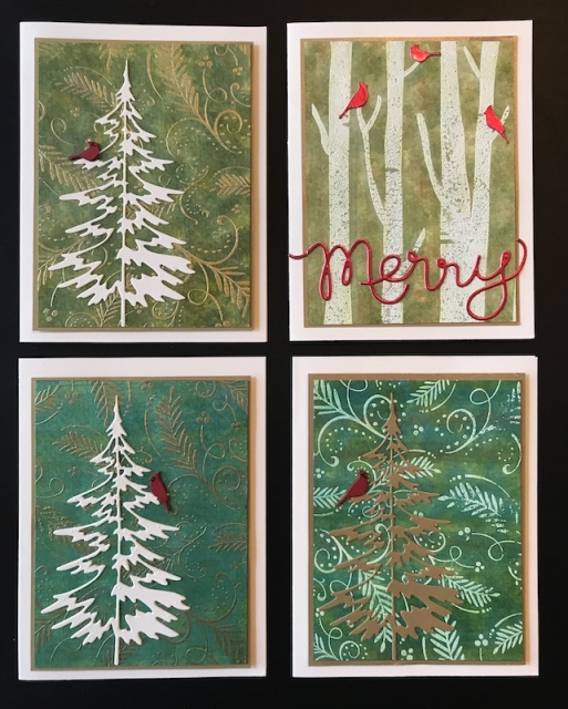 On the birch card I cut the sentiment and cardinals from a red metallic paper. I think it's from Tonic. I mounted that one directly to the card front so the sentiment could hang off the edges. The rest are mounted with foam tape.