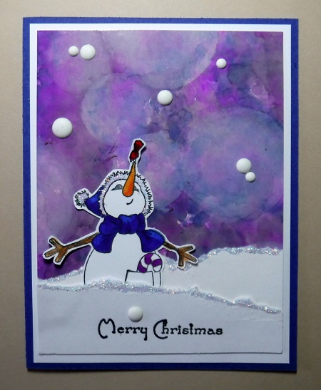 For the B prompt for February Christmas cards, I used the Bokeh technique. I made the polished stone look on glossy card stock using alcohol ink and then used a stencil with circles to lift off the ink in the circles using 98% alcohol. The stamps are from Sparkle N Sprinkle. I added Stickles glitter glue to the hat and snowbanks.
