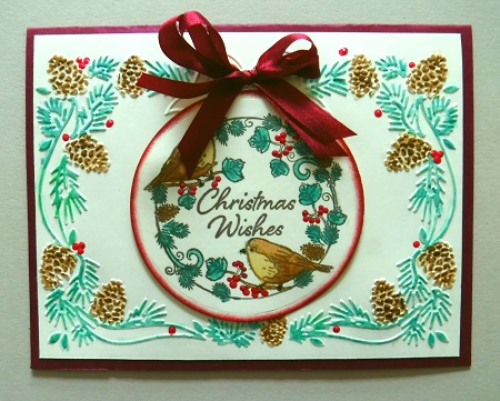 I used a stamp and embossing folder that I got from the Craft Magazine. I sponged over the raised areas on the embossing folder and watercolored the stamped image that was pop dotted to the center of the card. I used Liquid Pearls to do make the "berries" .