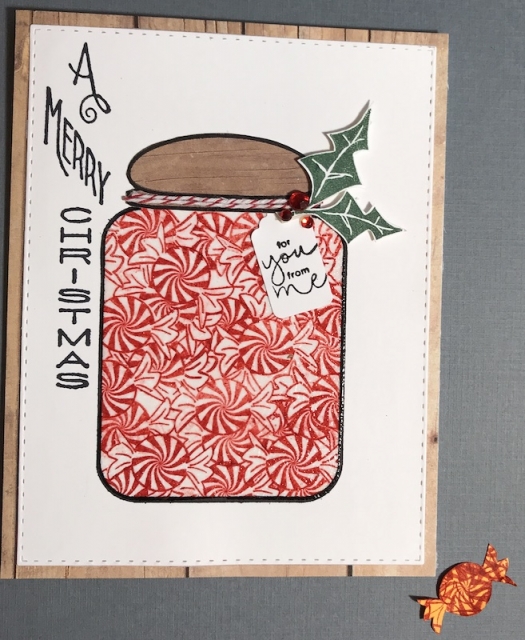 I mortise masked the jar again, this time to keep the peppermints inside. I stamped at least 8 or 9 peppermints in the foreground and created six peppermint masks and moved them around as I stamped more and more peppermints to fill the jar. I show one of the masks in the photo. When the jar was full, I inked it with Versamark and embossed it with a high gloss clear embossing powder (not showing well in the pic). The tag is a Martha Stewart punch. Glued twine to the lid (stamped and fussy cut from wood grain paper). I die cut the jar card front and matted it with woodgrain printed paper to a white A2 card base. Stamped, fussy cut and foam mounted the holly leaves, and added gems for berries.