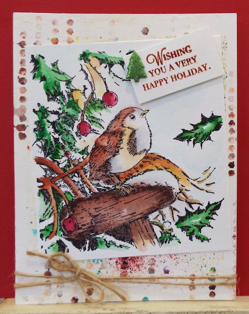 Stamped and colored image with Copics. Adhered stenciled piece I previously made to card base, and attached stamped panel. Adhered stamped quote with foam tape, and attached tree brad. Stamp: Northwoods. Quote: Recollections. Attached twine to bottom of card. TFL