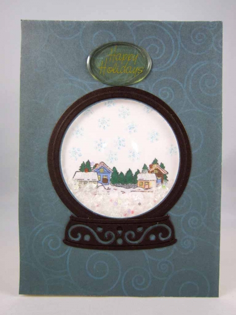 colored the stamp with markers and then added the little snowflake stamp from the kit, cut a whole with the globe die that comes in the kit and added some snow and glitter for the shaker bit, I did add some of the powder from my embossing pouch to the transparency before adding it so that my snow would not stick to it.
