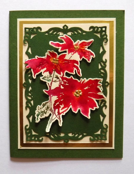 I used markers and colored directly on the stamp by Tim Holtz. Spritzed a little with water and stamped onto cream card stock. I cut it out with the die provided. This was pop dotted onto the green die frame from Spellbinders. Liquid pearls were used for the flower centers.