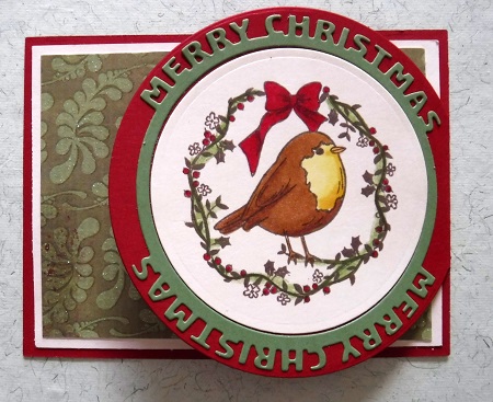 I used a new die I bought at a stamp show recently. The die made the card and the Merry Christmas around the image. The image is from the Cardmaker magazine. It was colored using alcohol markers.