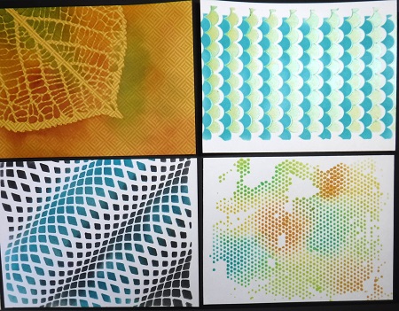 I bought exactly 4 new stencils recently! I used Distress inks on all of them, except I used a shimmery green paste on the scales stencil. The picture did not show the shimmer.